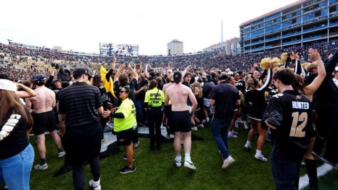 BOULDER, Colorado – Después de la victoria del sábado 24-17 sobre el No. 22 Iowa State, multitudes de fanáticos de Colorado invadieron el campo.