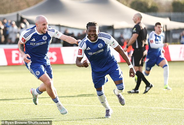 Isaac Buckley-Ricketts celebra el gol de la victoria contra el Crystal Palace en enero, que hizo historia en la Copa FA para el Macclesfield FC.