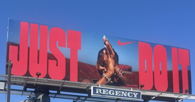 Varios carteles patrocinados por Nike que muestran a Laila Kirk, una corredora de primer año de 800 metros de Long Beach Poly y dos veces campeona nacional de la AAU, están apareciendo por toda la ciudad.