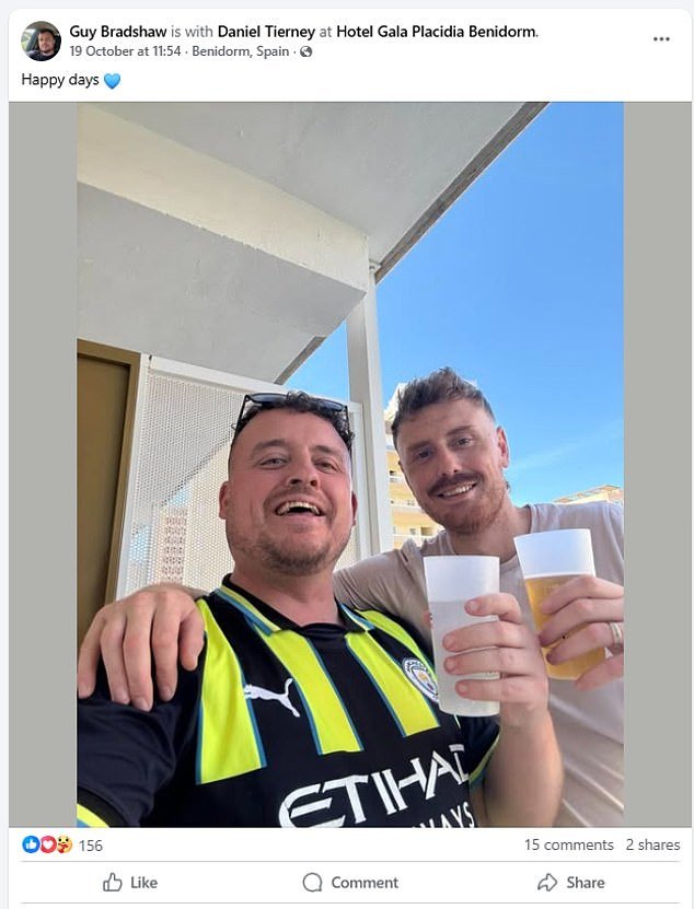 Guy Bradshaw, de 35 años, padre de uno de los dueños de un negocio de limpieza en Wythenshawe, viajó a Benidorm con amigos antes del partido del martes más al norte de la costa española.
