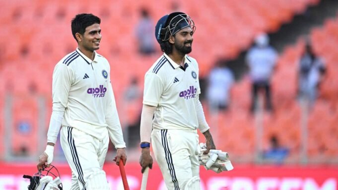 El Capitán India Shubman Gill (L) y su colega del equipo de KL Rahul abandonan el campo al final del primer día del primer partido de prueba de Cricket entre India e India occidental en el estadio Narendra Modi en Ahmedabad el 2 de octubre de 2025, Foto: R.