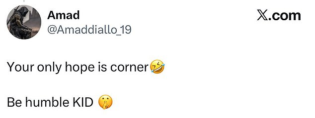 Amad tomó una publicación anterior de un aficionado que la publicó antes del partido: “El Arsenal gana 4-0, me acaba de enviar el guión”. El extremo citó la publicación con un gráfico que muestra el resultado completo y la leyenda: “Disfruta de tu bebé” y un emoji de guiño.