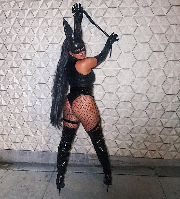 Su atrevido atuendo dejaba poco a la imaginación, con altas orejas de conejo negras y una máscara que cubría la mitad superior de su rostro, y un traje negro con recortes, medias de red, guantes negros brillantes y zapatos a juego completando el look.