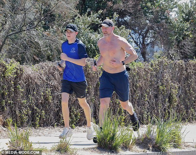 Su hijo Jett se unió al jugador de 53 años cuando corrieron en el parque en Melbourne, y Buckley sin camisa en un día cálido.
