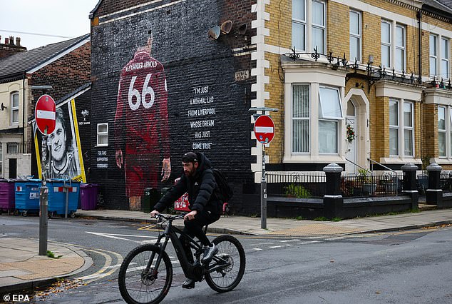 “Soy sólo un chico corriente de Liverpool cuyo sueño acaba de hacerse realidad”, se lee en un graffiti blanco sobre un fondo oscuro junto a una gran ilustración de Trent Alexander-Arnold en Sybil Road.