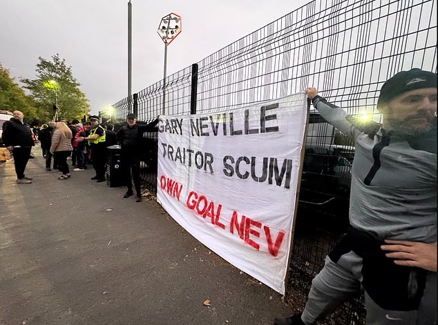Los fanáticos fueron vistos mientras sostenía el banner que leía “Gary Neville. Se trata del traidor. Su propio objetivo Nev” frente al hotel que sale en Old Trafford, mientras que otros fueron filmados con banderas de Union Jack con lámparas cercanas, de Neville reveló que ordenó la bandera de 400 millones de libras de construcción.