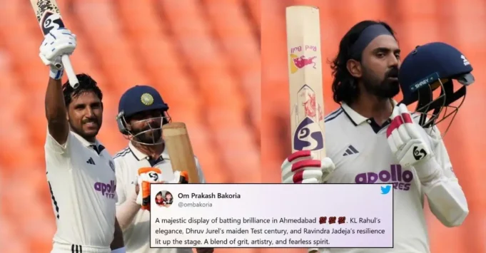 Un majestuoso espectáculo de parpadeo en Ahmedabad . La elegancia de KL Rahula, la edad de prueba Virgin de Dhruv Jure y la resistencia de Ravindra Jadieji iluminaron la escena. Una mezcla de arena, artesanía y espíritu intrépido.@Lhahu @Dhruvjurel21 @imjadaya @BCCI