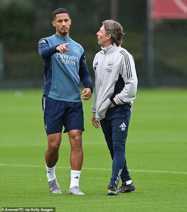Gabriel Heinze y William Saliba (izquierda) discuten tácticas defensivas durante una sesión de entrenamiento del Arsenal
