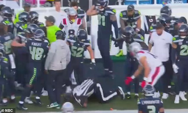 El desagradable incidente, que ocurrió con 9:58 restantes en el segundo cuarto del juego, hizo que los jugadores corrieran en ayuda de un árbitro lesionado en la banca de los Seahawks.