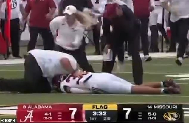 El sábado, Derek Meadows de Alabama quedó noqueado tras un brutal golpe contra Missouri.