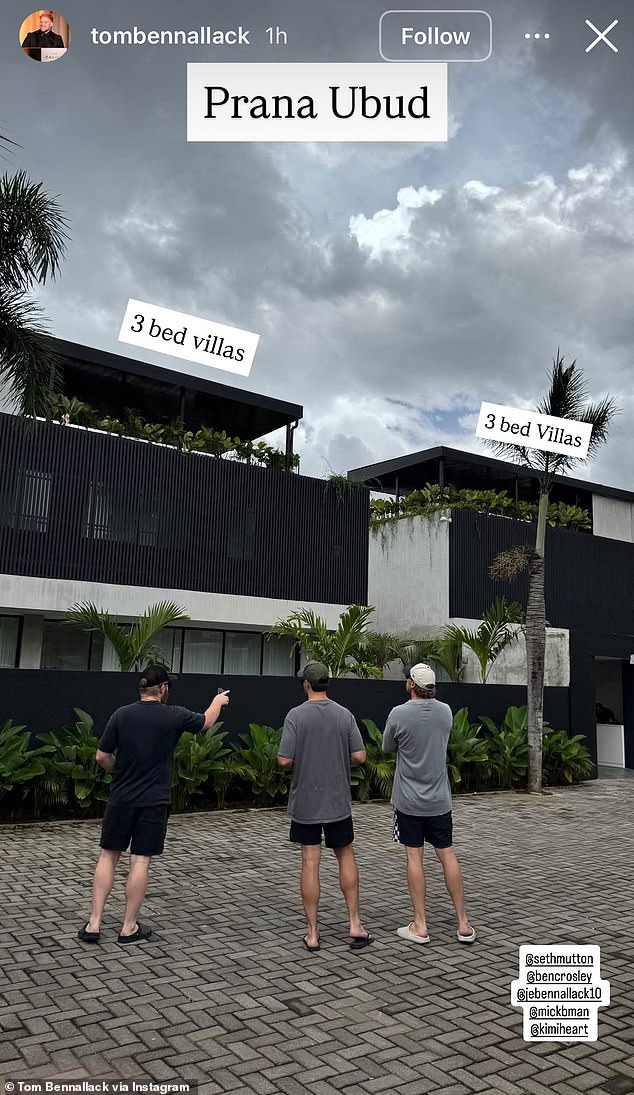 El marido de Tess Crosley, Ben, y algunos amigos viajaron a Bali para ver algunas de sus propiedades de inversión. Crosley fue etiquetado en la foto por su amigo Tom Bennallack, quien aparentemente le estaba dando un recorrido por las nuevas villas en Bali.