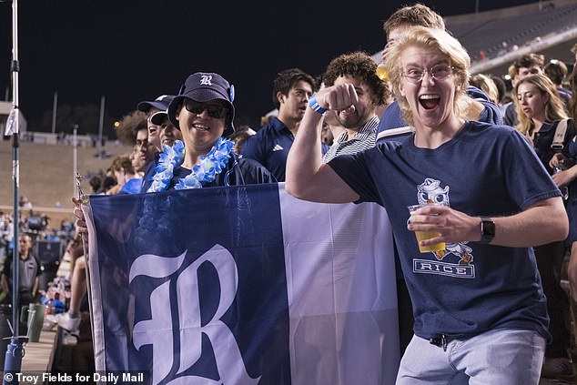 Estudiante de Rice sonríe mientras recibe una Busch Light gratis durante la derrota del sábado en Houston