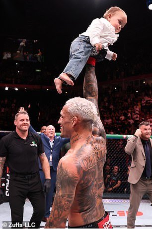 La leyenda de UFC Charles Oliveira celebró su victoria levantando a su hijo en el aire con una mano