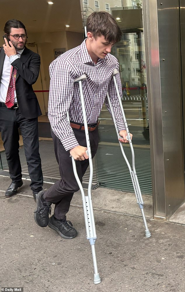Ethan Ungerbock, de 20 años, compareció ante el tribunal con muletas después de romperse el dedo del pie el lunes (en la foto)