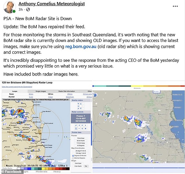 “Para aquellos que monitorean tormentas en el sureste de Queensland, vale la pena señalar que el nuevo sitio de radar BoM ahora está funcionando y muestra imágenes más antiguas”, escribió en Facebook.