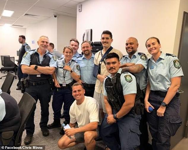 El agente Scott Dyson (en la foto, de pie en el centro) visita a sus colegas por primera vez desde que recibió un disparo en el ataque de Bondi Beach.