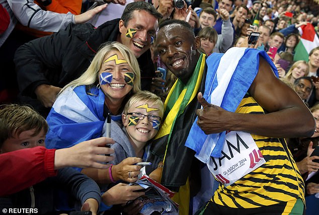 Usain Bolt celebra con sus fans tras la final de relevos 4x100m en Glasgow, 2014.
