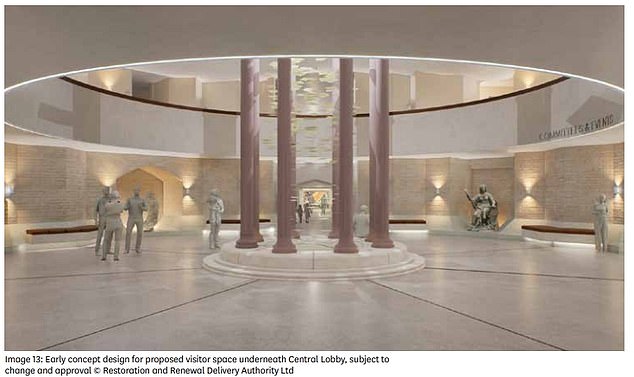 Las impresiones del artista muestran cómo la mejora podría crear vastos atrios subterráneos con techos de cristal y nuevas y costosas instalaciones para que los parlamentarios se “reúnan con sus electores”.