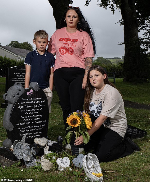 Hazel Louise Jones con su hija Amelia-Louise Roxanne Davies y su hijo Ethan-Daniel Richard Davies en la tumba de April en el cementerio Machynlleth en Gales