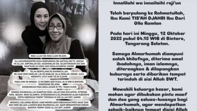 “Innalilahi Wa Innaylahi Rojiyun. Nuestra madre de Olla Ramlan fue a ver a la madre de Tisa Dajahree, Rahamatullah, hoy, 12 de octubre de 2025, a las 04.15 en Bintaro en Bintaro, South Tangerang, mensaje familiar de Olla Ramlan el domingo de 2025.