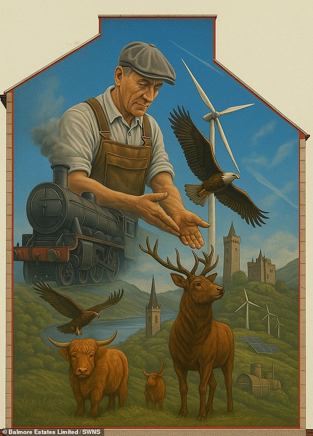Diseñado para mostrar lo mejor del clima escocés, el mural presenta molinos de viento, vacas de las Highlands, un tren de vapor y una criada con gorra y delantal.