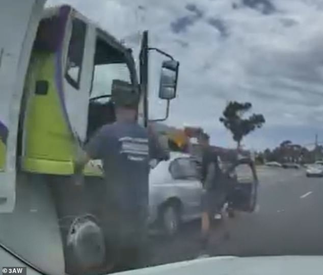 Imágenes horribles capturaron el momento en que un conductor anciano fue atacado por dos extraños en un ataque de furia al volante en una concurrida carretera de Melbourne.