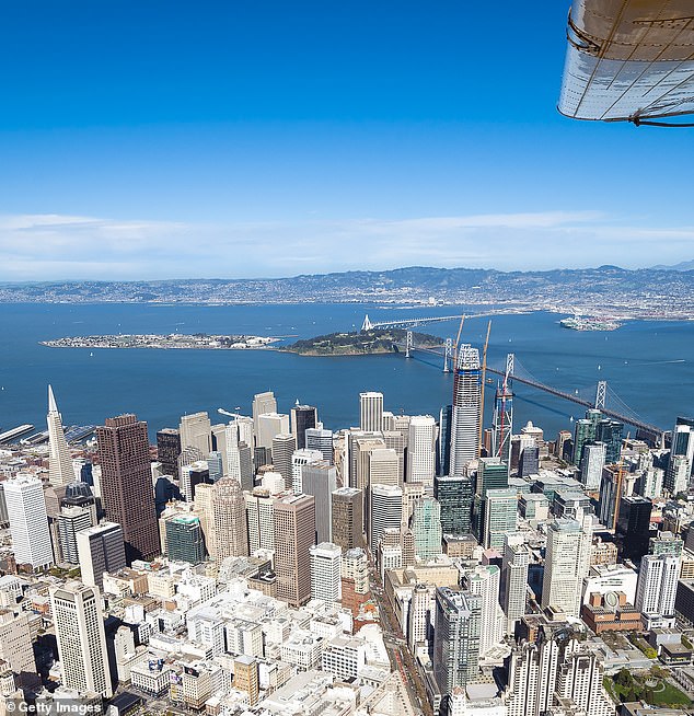 Treasure Island (a la izquierda del puente que cruza el agua) tiene 400 acres y fue construida para la Exposición Internacional Golden Gate de 1939 antes de servir como base naval hasta 1997.