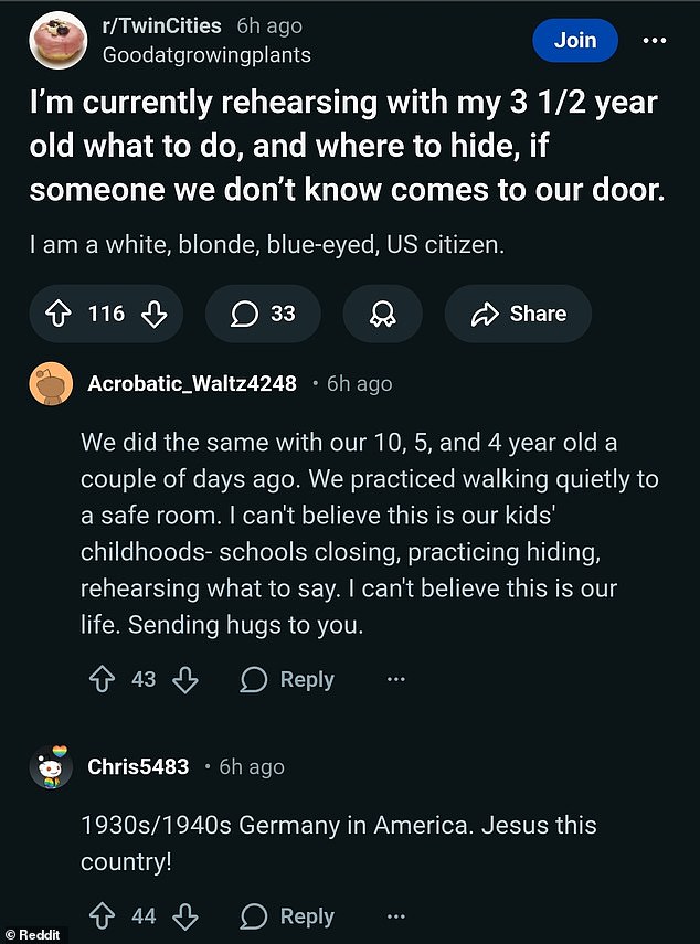“Los liberales blancos en Minneapolis están discutiendo en Reddit cómo están torturando a sus propios hijos para prepararlos en caso de que los agentes de ICE irrumpan en sus casas y los secuestran”, escribió Andy Ngo, editor senior de The Post Millennials, en X.