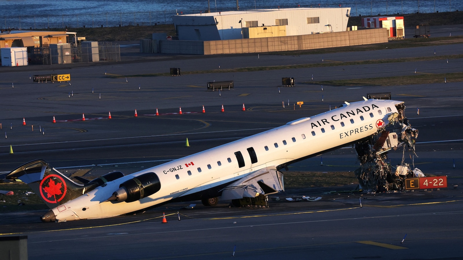 Los restos de un avión de Air Canada Express que chocó con un vehículo terrestre en el aeropuerto LaGuardia de Nueva York, el 24 de marzo de 2026.