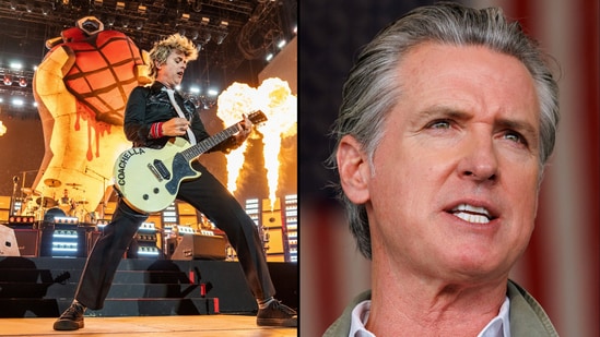 El gobernador de California, Gavin Newsom, fue visto en un concierto políticamente cargado de la semana del Super Bowl mientras el líder de Green Day, Billie Joe, critica a ICE y Trump ((Foto de Green Day por Amy Harris/Invision/AP, Archivo) (Foto de Gavin Newsom REUTERS/Mike Blake))