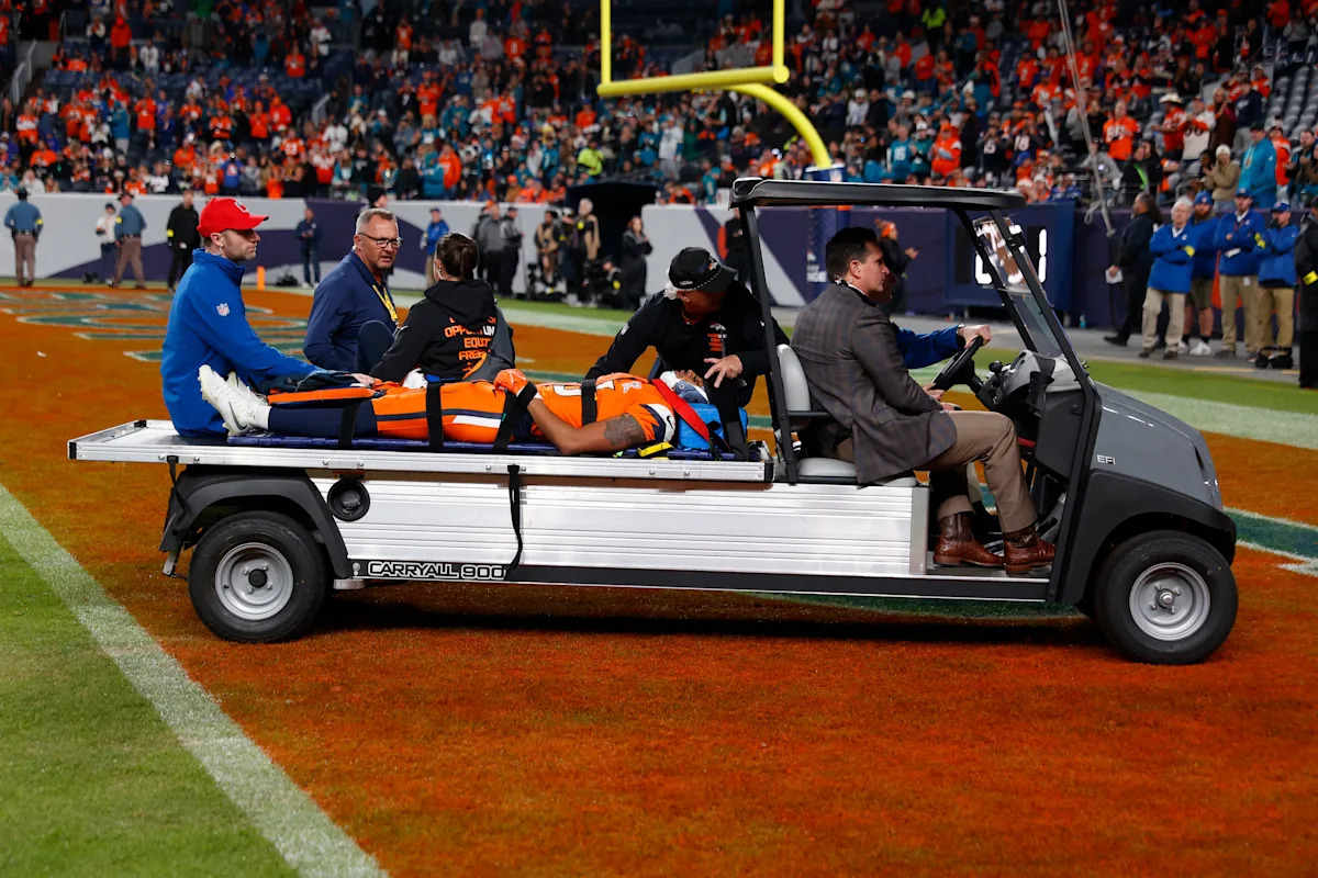 Los jugadores de los Jaguars en el campo se arrodillaron y los jugadores de los Broncos rodearon a su compañero de equipo mientras lo inmovilizaban en una camilla y finalmente lo colocaban en una camilla.