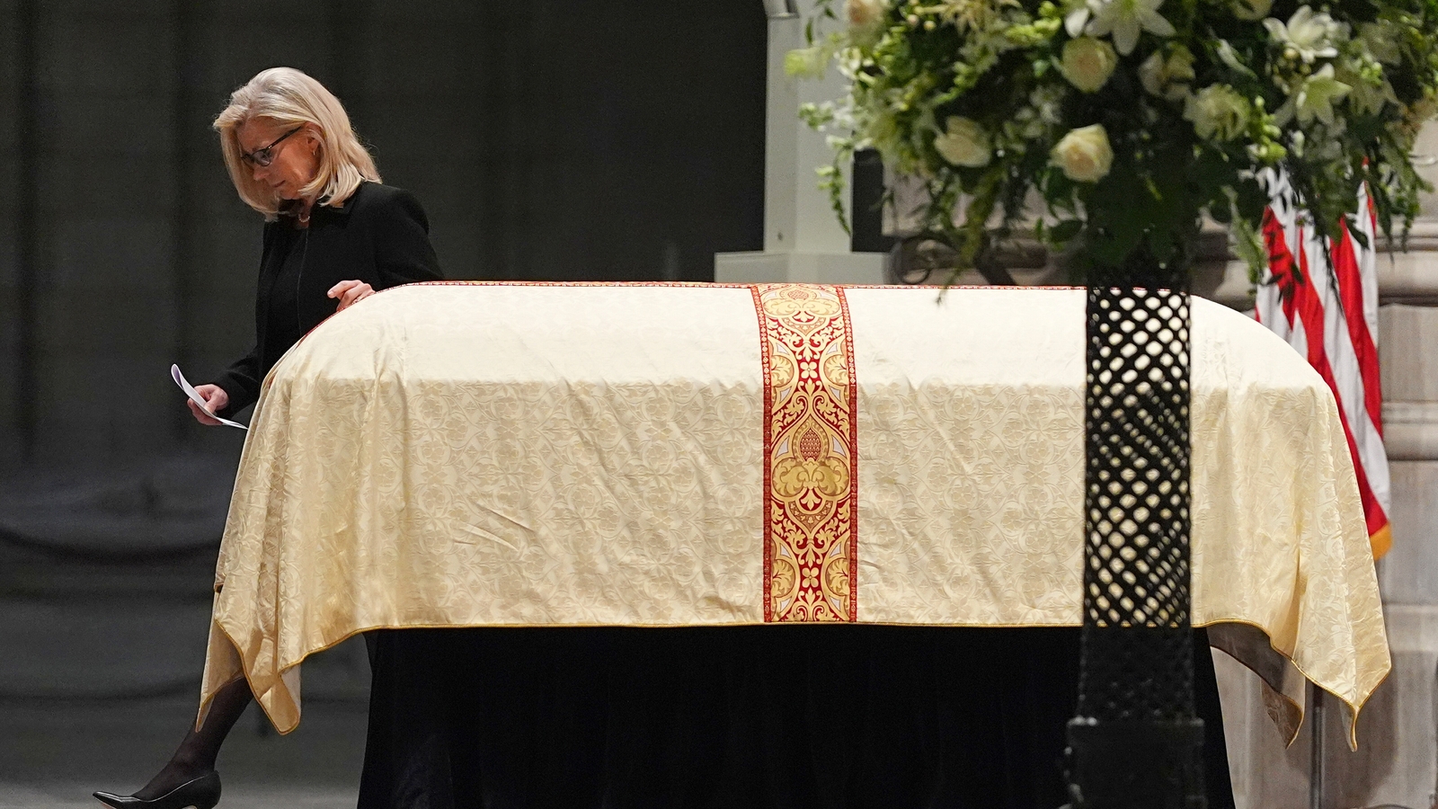 La ex representante Liz Cheney pasa junto al ataúd de su padre después de rendir un homenaje en el funeral del ex vicepresidente Dick Cheney. (AP)