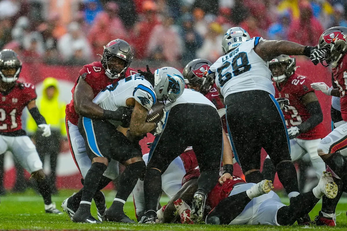 Un ataque terrestre de dos frentes de los Carolina Panthers que ocupó el puesto 11 en la NFL en yardas por juego el sábado fue arrasado por la lluvia de Tampa en un enfrentamiento de la NFC Sur que los Buccaneers ganaron 16-14.