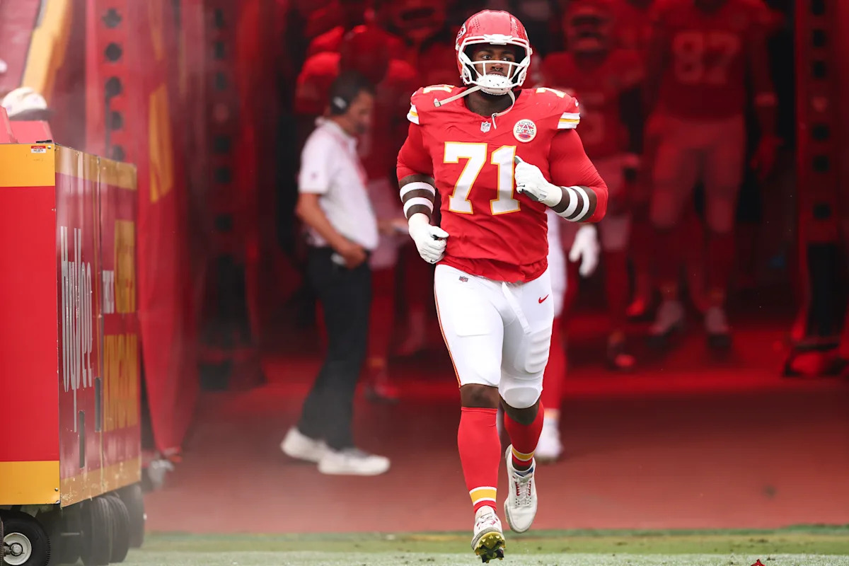 El tackle novato de los Kansas City Chiefs, Josh Simmons (71), se perdió cuatro juegos mientras lidiaba con un asunto personal antes de regresar a la acción el domingo pasado. (Foto de Perry Knotts/Getty Images)