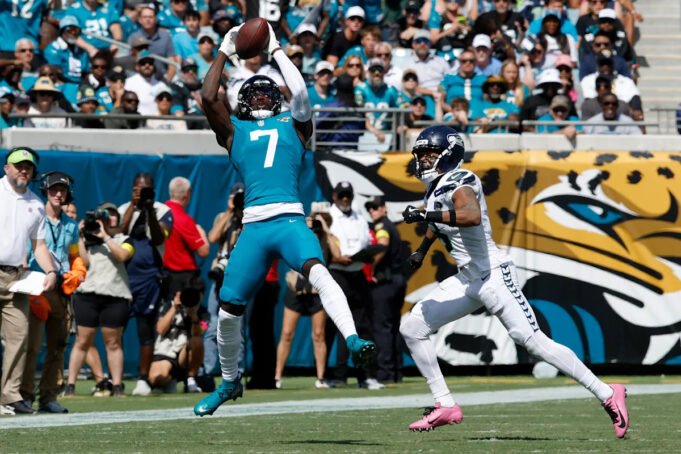 Medio punto de fantasía PPR cuenta para Brian Thomas Jr. si Travis Hunter no se alineó en fuera de juego. En el tercer cuarto, Trevor Lawrence golpeó a Thomas para un segundo touchdown, este para 54 yardas en recepción y 0 puntos de fantasía, cuando lo llamaron para que Hunter se alineara en fuera de juego.