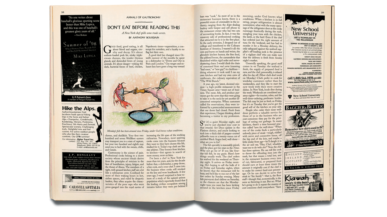 El elaborado pasaje de Bourdain que explica por qué esto era cierto se publicó por primera vez en El neoyorquinoen el ensayo de 1999 “No comas antes de leer esto”, que rápidamente amplió en “Kitchen Confidential”. (La respuesta corta fue que “muchos proveedores de pescado no realizan entregas los sábados, por lo que es probable que el atún que desea el lunes por la noche haya estado en la cocina desde el viernes por la mañana, en Dios sabe qué condiciones”; la respuesta larga lo sumergió en la cultura y la psicología de la industria de los restaurantes). Lo escribió, originalmente, para un semanario alternativo llamado Nueva York. Prensaquien lo había planeado como portada antes de que el editor lo cancelara en el último minuto. Bourdain imaginó que su público sería insular y pequeño: “Pensé que iba a escribir algo que entretendría a otros cocineros, tal vez ganaría cien dólares y mi cocinero pensaría que era divertido”, recordó en 2017, durante una aparición en el New Yorker Festival. Cuando se publicó el artículo. El neoyorquino—después de que la madre de Bourdain le sugiriera a un neoyorquino Veces su colega Esther Fein, que el marido de Fein, David Remnick, el nuevo editor de la revista, podría querer echarle un vistazo: “Transformó mi vida en dos días”, dijo.