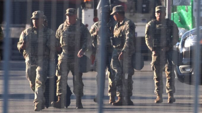 Miembros de la Guardia Nacional marchan a través de las instalaciones de Broadview del Servicio de Inmigración y Control de Aduanas de EE. UU. en Chicago el 9 de octubre de 2025.