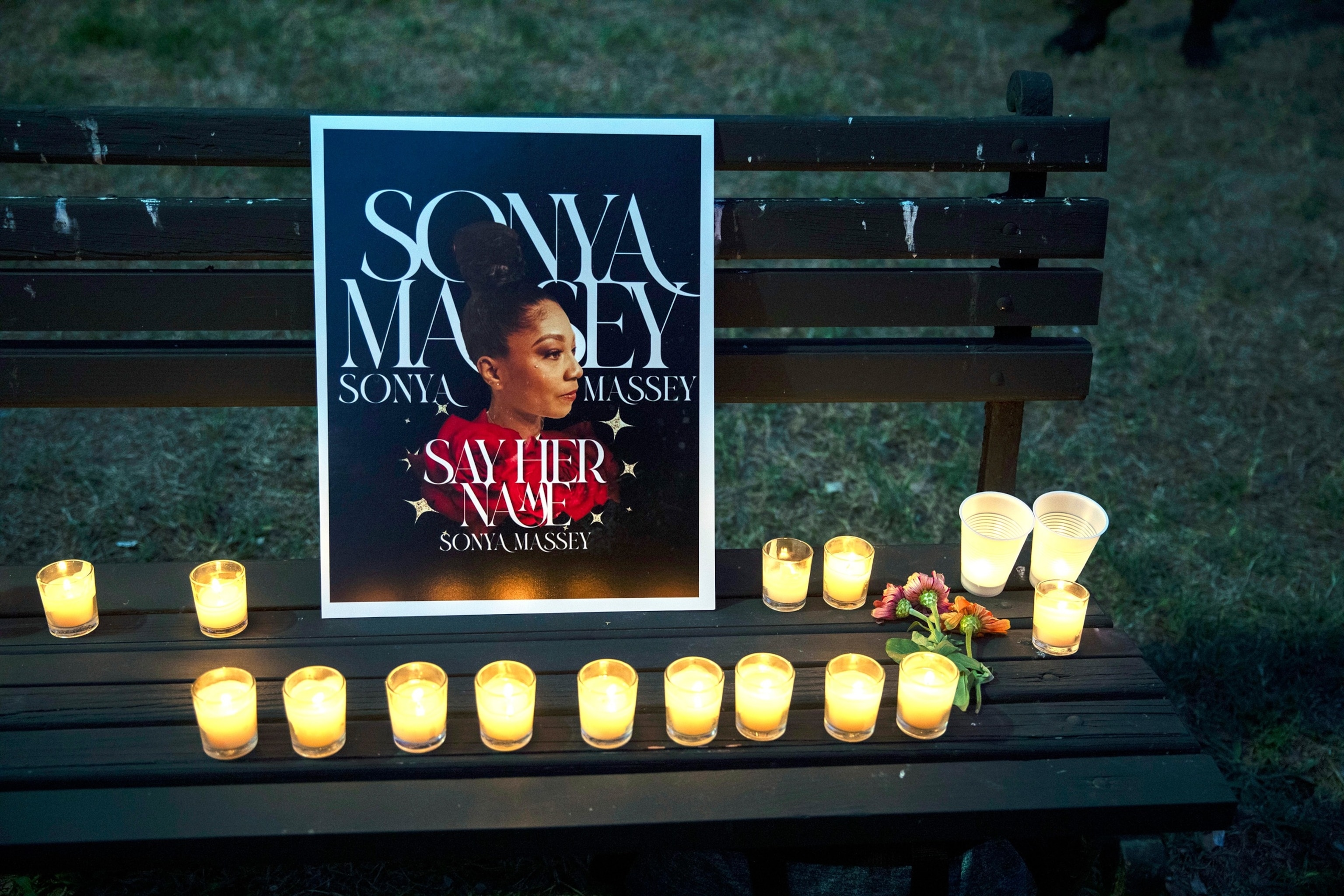 En esta fotografía de archivo del 27 de julio de 2024, los dolientes encienden velas mientras asisten a una vigilia por Sonya Massey en Folger Park en Washington, DC.