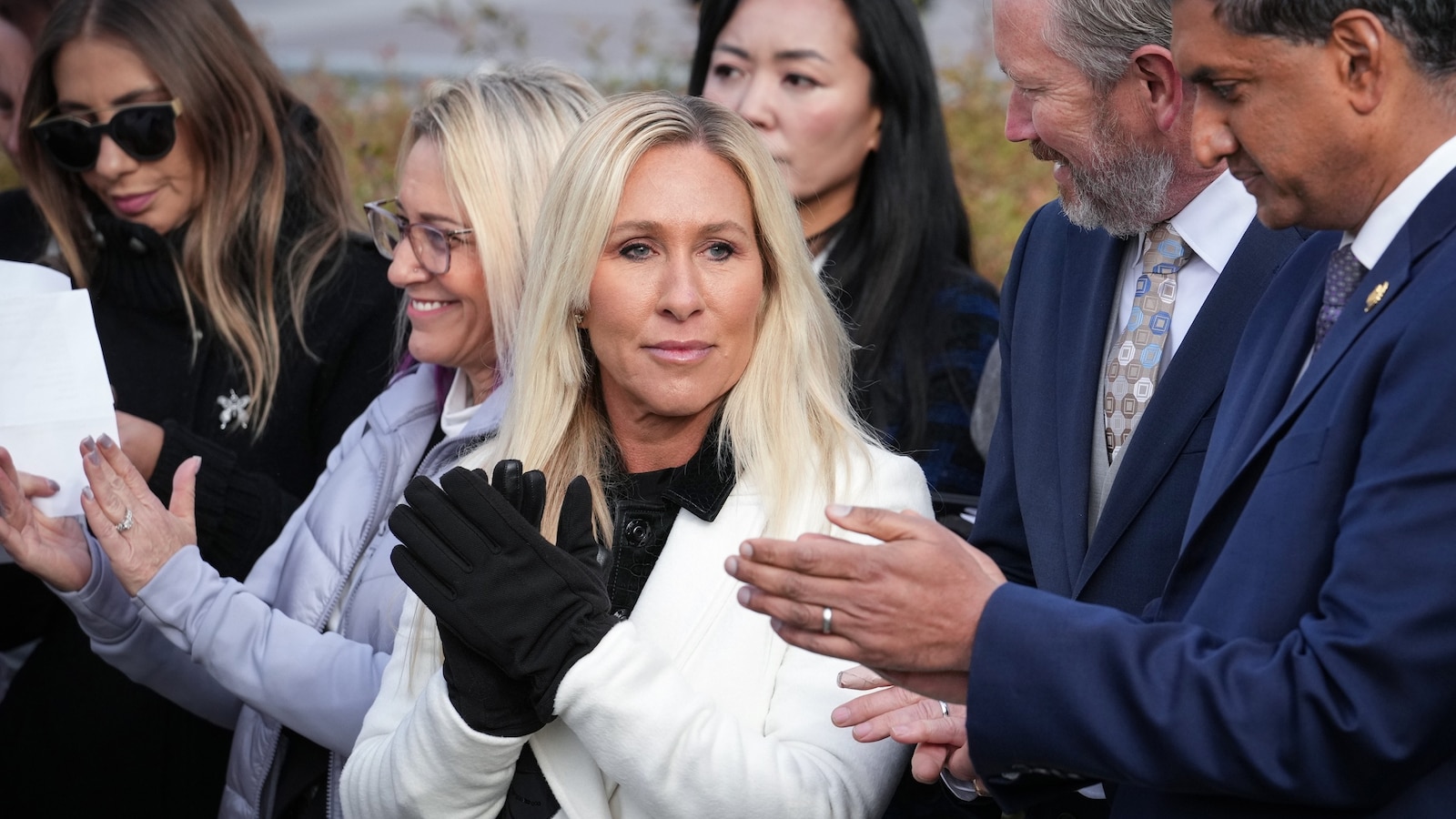 La representante Marjorie Taylor-Greene, republicana por Georgia (centro), aplaude durante una conferencia de prensa mientras la Cámara se prepara para votar sobre la Ley de Transparencia de Archivos Epstein, en el Capitolio de Washington, el martes 18 de noviembre de 2025.