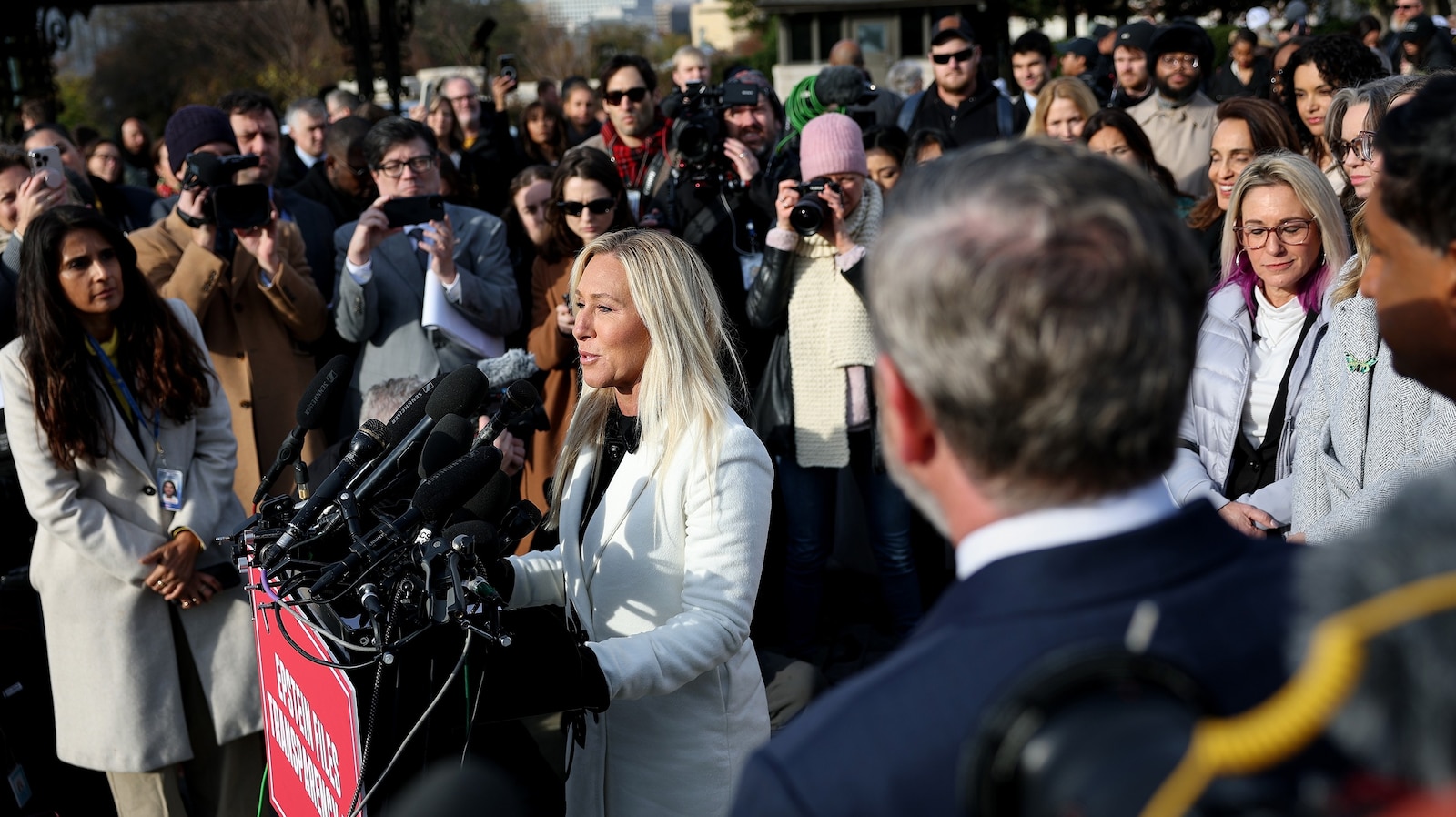 La representante republicana Marjorie Taylor Greene respondió al presidente Donald Trump el martes durante una conferencia de prensa afuera del Capitolio de Estados Unidos junto a mujeres víctimas del delincuente sexual recientemente condenado Jeffrey Epstein.