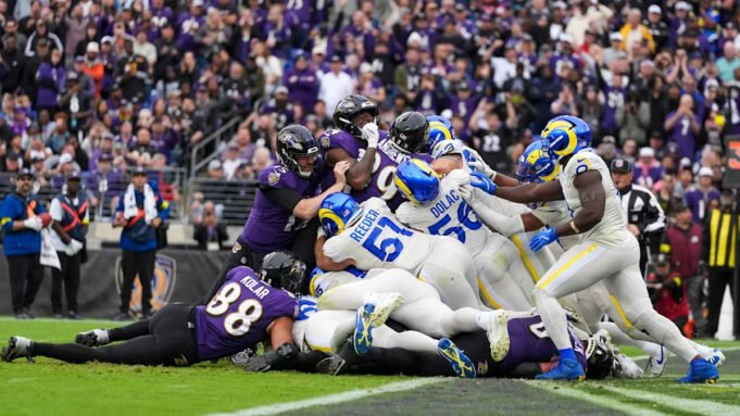 Los Baltimore Ravens tuvieron dos oportunidades en la línea de gol el domingo contra Los Angeles Rams. Fueron bloqueados en ambas ocasiones y tuvieron suerte de no perder el balón para un touchdown defensivo.