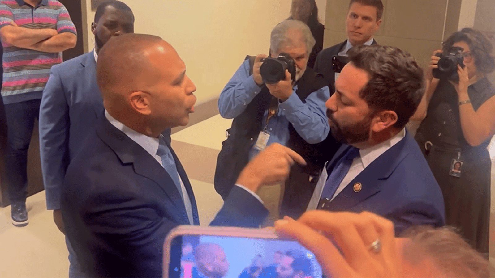 Jeffries, un demócrata, estaba hablando con los periodistas cuando Lawler, un republicano, se le acercó y lo confrontó… preguntándole por qué no firmaría un proyecto de ley que reabriría el gobierno federal.