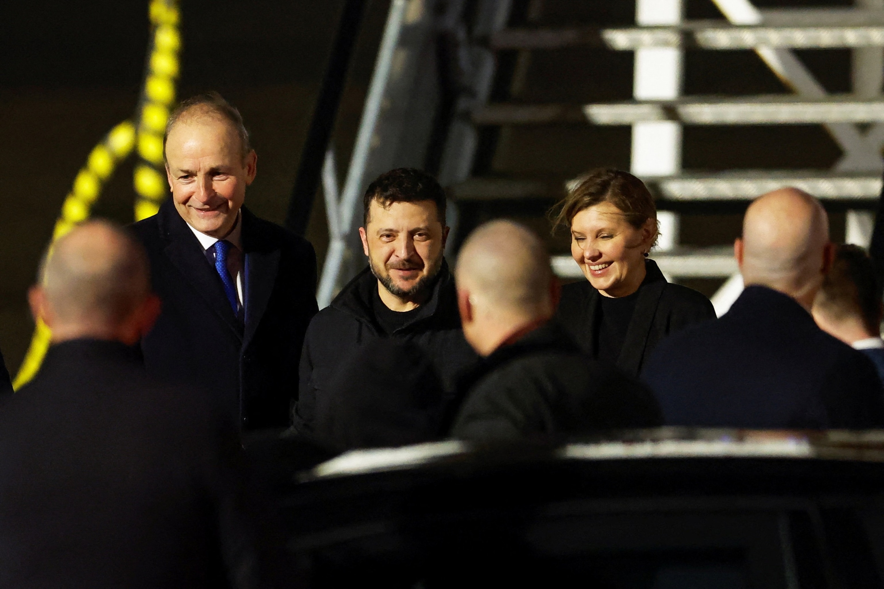 Taoiseach Micheal Martin, centro izquierda, habla con el presidente ucraniano Volodymyr Zelenskyy y la primera dama Olena Zelenska cuando llegan al aeropuerto de Dublín para su visita a Irlanda, el lunes 1 de diciembre de 2025.