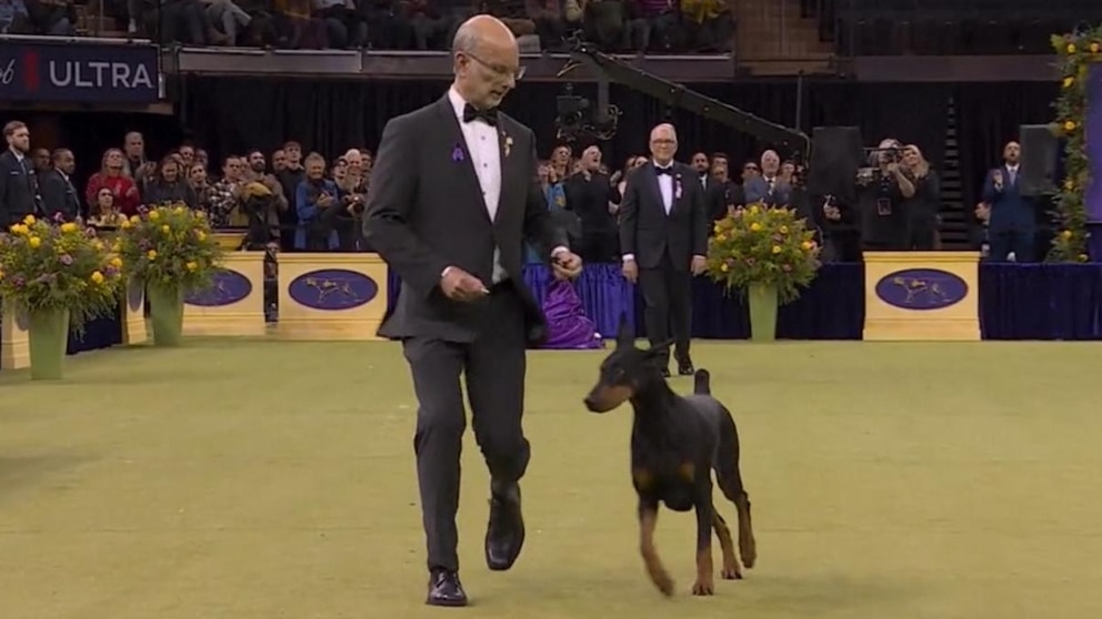 Danny New de ABC News informa cómo Penny, el Doberman pinscher, venció a 2.500 perros para ganar el premio al mejor de la exposición en la exposición canina número 150 del Westminster Kennel Club.