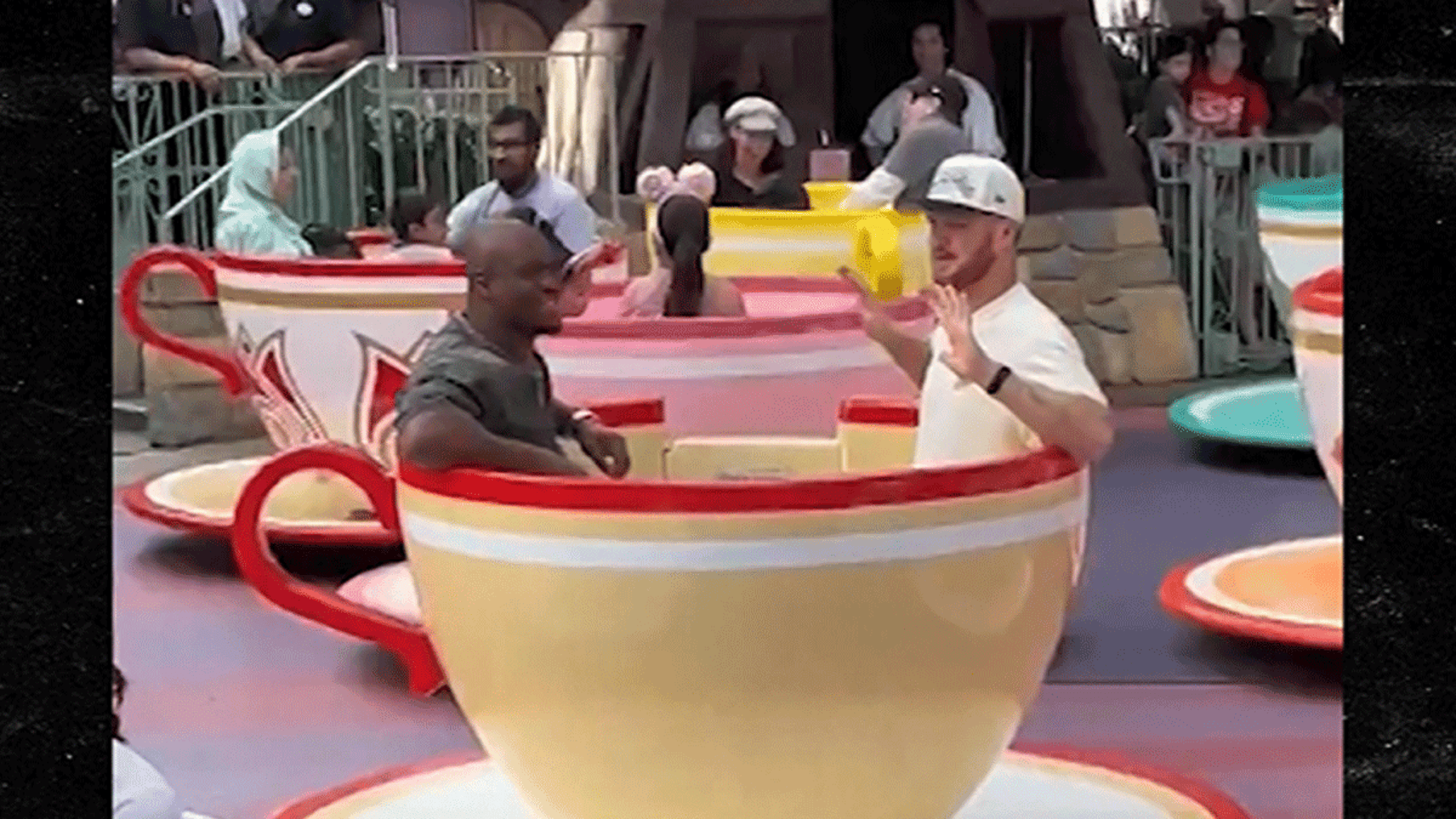 Sam Darnold Y Ken Walker Debieron haber mantenido su fiesta del Super Bowl al mínimo… porque no dudaron en viajar en una taza de té giratoria en Disneyland el lunes… ¡¡y ni una sola pieza explotó!!