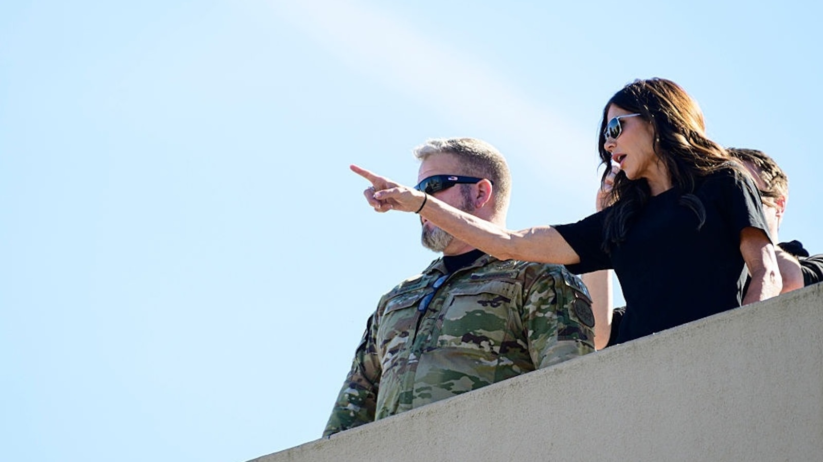 El Secretario Americano de Seguridad Nacional, Kristi Noem, observa el lugar de las manifestaciones actuales en la instalación de la aplicación de inmigración y aduanas (ICE) el 7 de octubre de 2025 en Portland, Oregon. El Secretario Noem llegó a Portland el martes para reunirse con la policía en medio de una disputa entre los funcionarios de la administración Trump y Oregón sobre el despliegue de la Guardia Nacional en el estado.