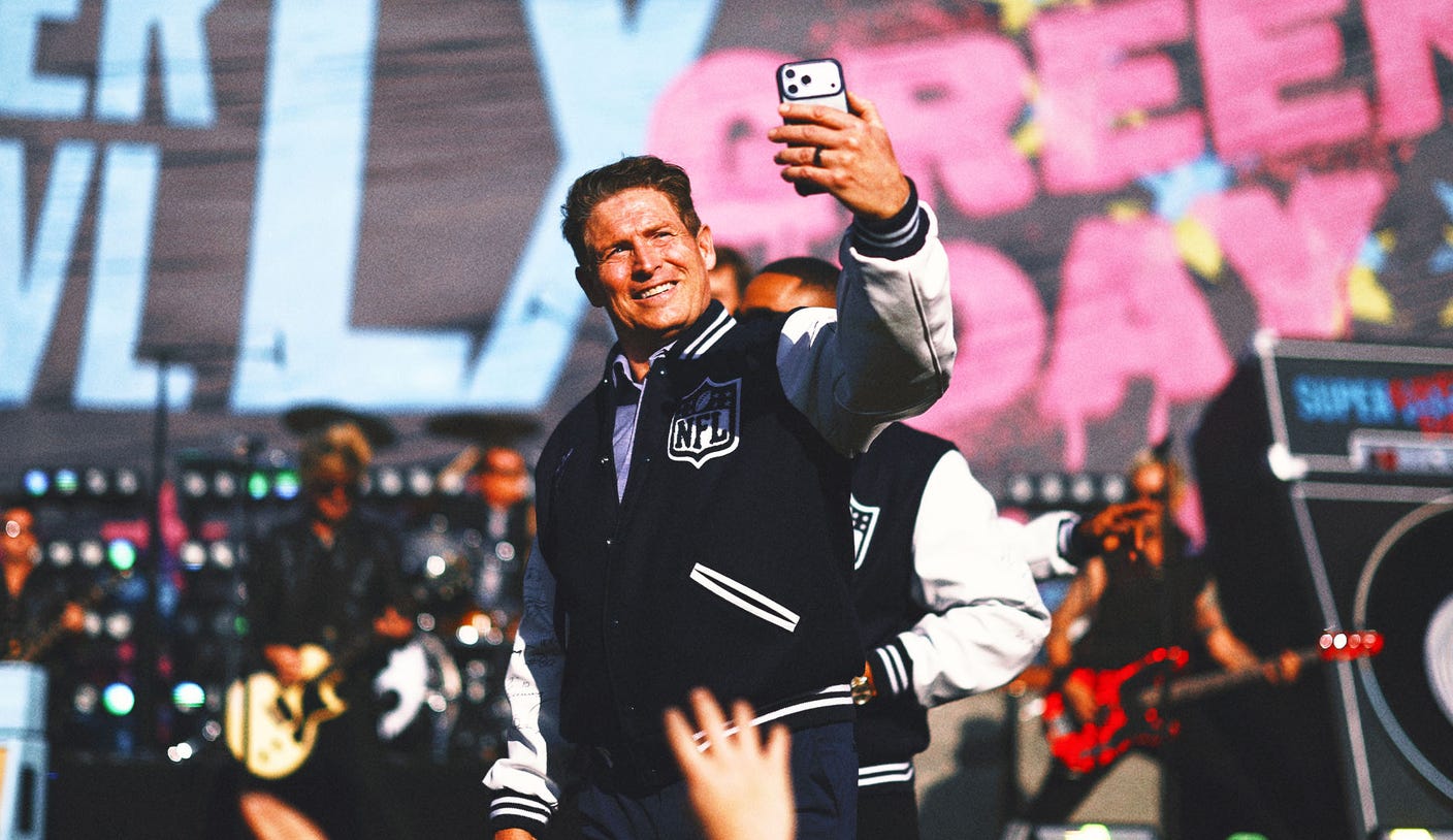 Steve Young se toma una selfie desde el escenario durante la presentación previa al juego de Green Day en el Super Bowl 60. (Kevin Sabitus/Getty Images)
