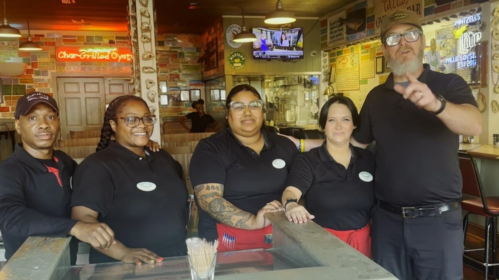 Jimmy Rush y su padre de 99 años son los primeros clientes de Wintzell’s Oyster House en Alabama en ofrecer la recompensa del restaurante de ostras gratis a cualquier persona de 80 años acompañada por su padre.
